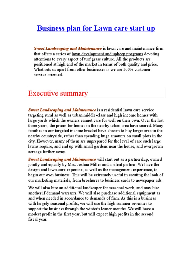 In which case the lawn care business plan will have to be very detailed and be able to to convince the financiers that the business is a profitable venture. More business plan help for how to write a business plan for a lawn care gardening or landscaping business on my apps. The industry is vulnerable to recession as lawn care is a luxury.